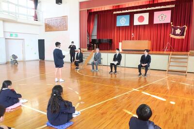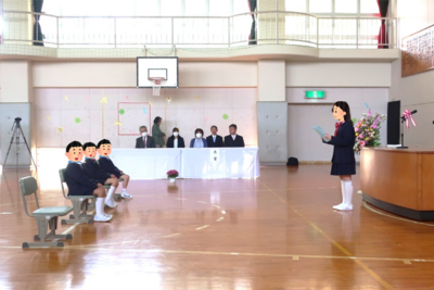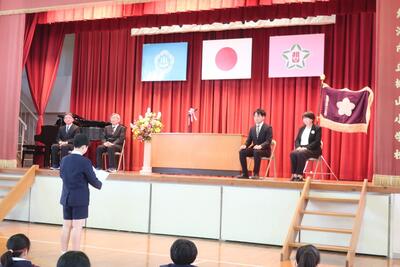 児童会会長から歓迎の言葉が伝えられました。「桃山小のいいところは、他の学年の人とも仲良しで、困ったときには助け合えるところです。」