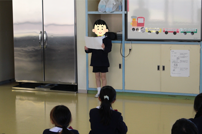 1年生の代表児童が、2学期をふり返ってがんばったことを発表しました。まごころを込めた挨拶を続けてきたことを、堂々と伝えてくれました。