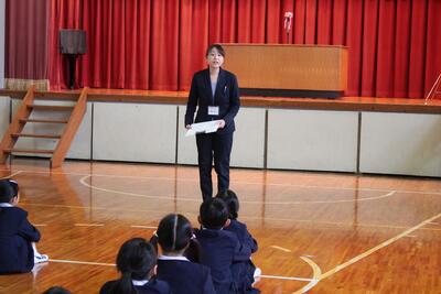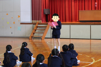 最後に、6年生の代表が、今年度の抱負を述べました。下級生にやさしくすること、あいさつをがんばりたいこと、目標に向かって取り組んでいきたいことなど、最上級生らしく堂々と発表することができました。